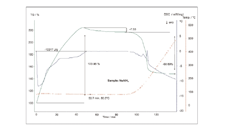 The NaAlH4 sample was tested at a specific humidity using DSC-TG synchronous thermal analysis with a steam furnace. The sample was first held at 80°C, then ramped to 500°C. During the initial phase of testing, NaAlH4 reacted with steam, causing an increase in sample mass, while the corresponding DSC curve showed a strong exothermic peak. This reaction released hydrogen while forming hydroxides. Once the temperature exceeded 100°C, the hydroxides decomposed to form the corresponding oxides. At this stage, the sample exhibited bubbling, and a strong endothermic effect was observed on the DSC curve.